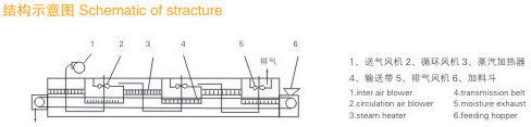 物料由加料器均勻地鋪在網(wǎng)帶上,網(wǎng)帶一般采用12-60目不銹鋼絲網(wǎng),由傳動(dòng)裝置拖動(dòng)在干燥機內移動(dòng)。干燥機由若干單元組成,每一單元熱風(fēng)單獨循環(huán),部分尾氣由專(zhuān)門(mén)排濕風(fēng)機排出,廢氣由調節閥控制,熱氣由下往上或由上往下穿過(guò)鋪滿(mǎn)物料的網(wǎng)帶完成熱量與質(zhì)量傳遞的進(jìn)程,帶走物料水份。網(wǎng)帶緩慢移動(dòng),運行速度可根據物料溫度自由調節,干燥后的成品連續落入收料器中。上下循環(huán)單元根據用戶(hù)需要可靈活配備,單元數量亦可根據需要選取。