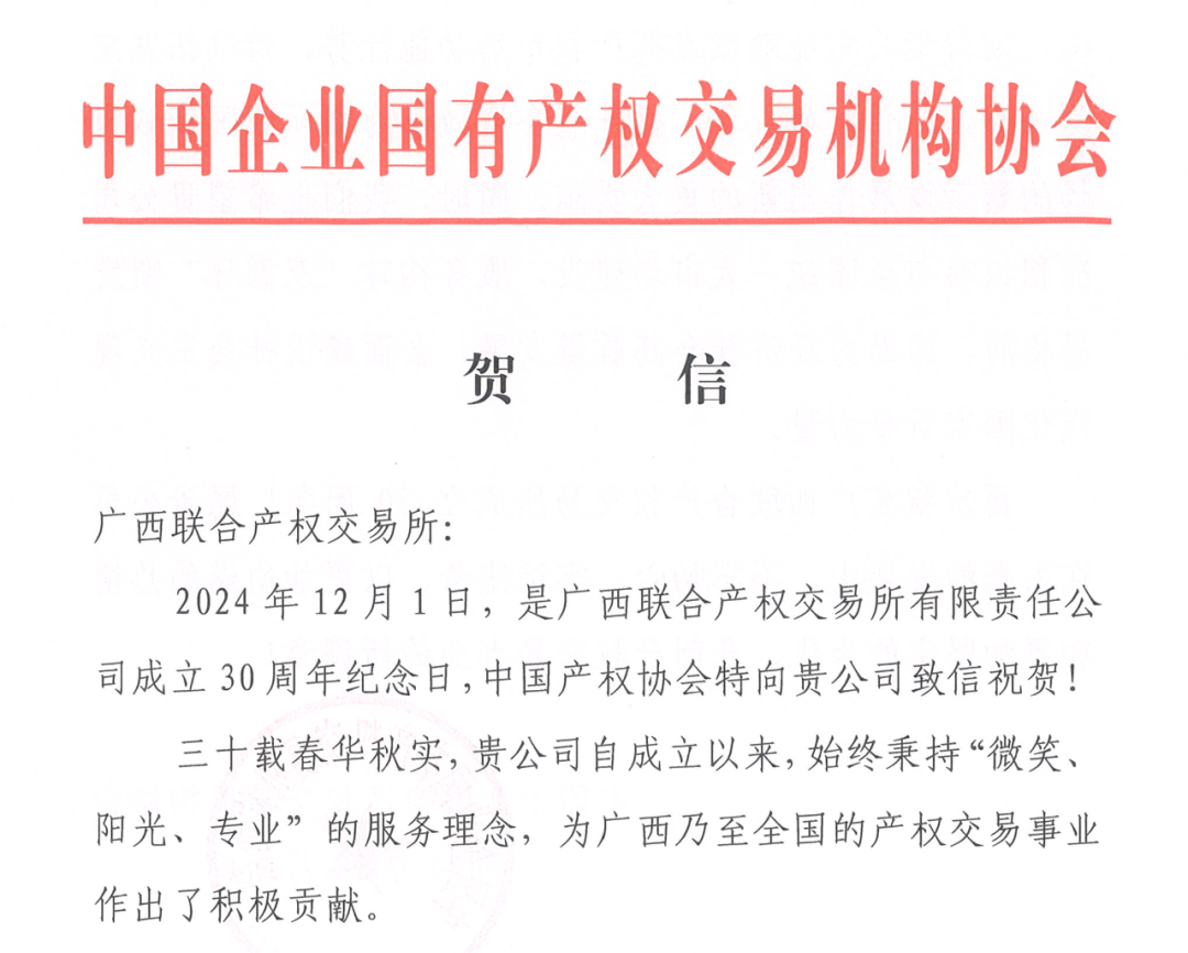 中國企業(yè)國有產權交易機構協(xié)會致信祝賀廣西聯(lián)合產權交易所成立30周年