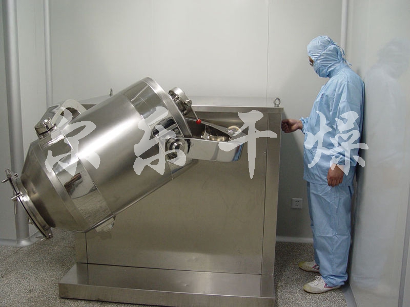 結構:該機由機座、傳動(dòng)系統、電器控制系統、多向運動(dòng)機構、混合筒等部件組成。與物料直接接觸的混合筒采用優(yōu)質(zhì)不銹鋼材料制造,桶體內外壁均經(jīng)鏡面拋光。