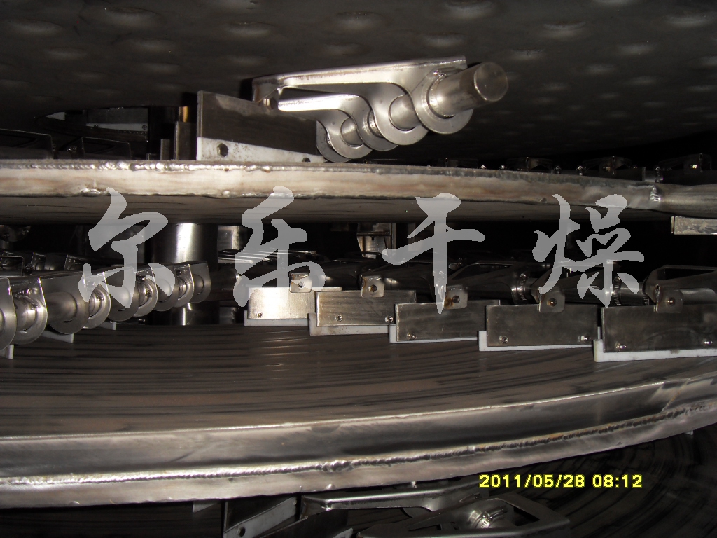 濕物料自加料器連續地加到干燥器上部一層干燥盤(pán)上,帶有耙葉的耙臂作回轉運動(dòng)使耙臂作回轉運動(dòng)使耙葉連續地翻抄物料。物料沿指數螺旋線(xiàn)流過(guò)干燥盤(pán)表面,在小干燥盤(pán)上的物料被移送到外緣,并在外緣落到下方的大干燥盤(pán)外緣,在大干盤(pán)上物料向里移動(dòng)并從中間落料口落如下一層小干燥盤(pán)中。大小干燥盤(pán)上下交替排列,物料得以連續地流過(guò)整個(gè)干燥器。中空的干燥盤(pán)內通入加熱介質(zhì),加熱介質(zhì)形式有飽和蒸汽、熱水和導熱油,加熱介質(zhì)由干燥盤(pán)的一端進(jìn)入,從另一端導出。已干物料從后一層干燥盤(pán)落到殼體的底層,最后被耙葉移送到出料口排出。濕份從物料中逸出,由設在頂蓋上的排濕口排出,真空型盤(pán)式干燥器的濕氣由設在頂蓋上的真空泵口排出。從底層排出的干物料可直接包裝。通過(guò)配加翅片加熱器、溶劑回收冷凝器、袋式除塵器、干料返混機構、引風(fēng)機等輔機,可提高其干燥的生產(chǎn)能力,干燥膏糊狀和熱敏性物 料,可方便地回收溶劑,并能進(jìn)行熱解和反應操作。